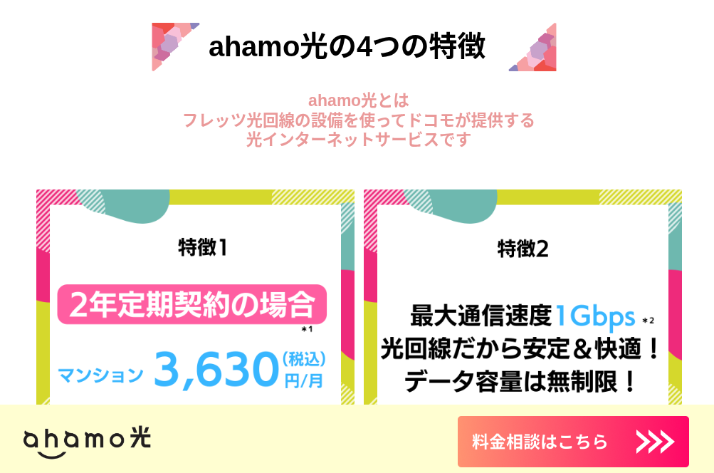 シンプルかつ、最も手間なく月額料金を安くしたい方はahamo光がオススメです。